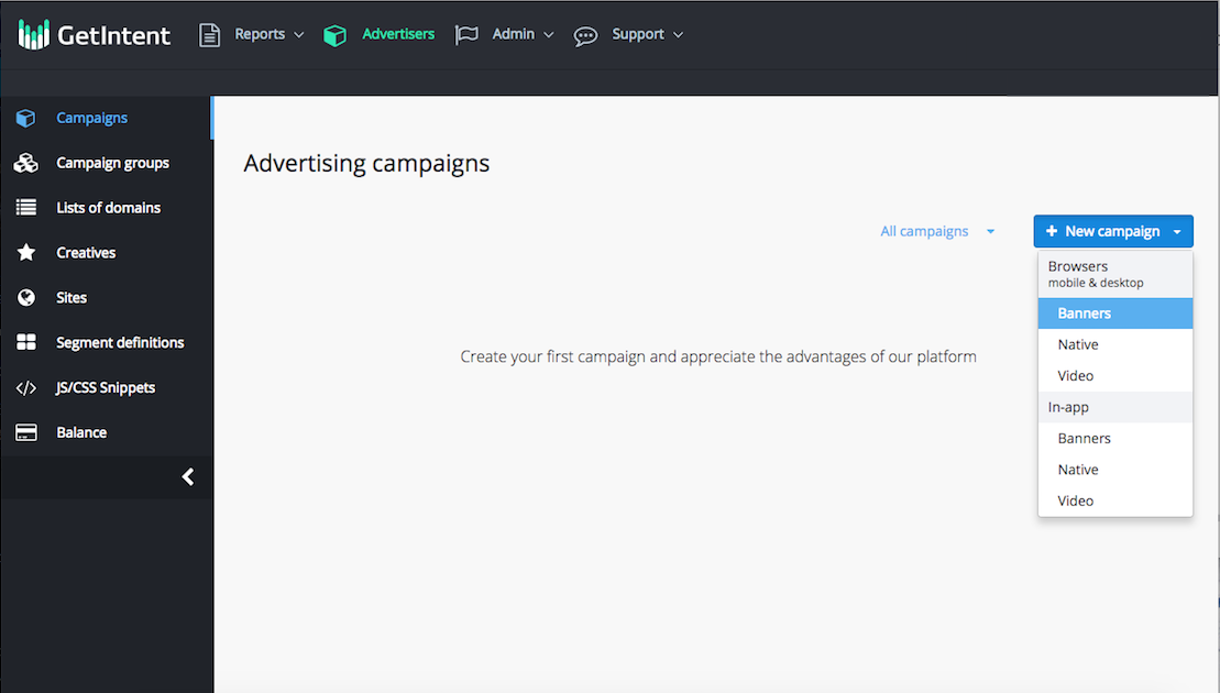 1. Go to the "Campaigns" tab and create a new browser desktop advertising campaign. For this, press "New campaign" and choose, what kind of creative you want to use - Banners, Native or Video. Different types of creatives will lead to different creative settings later: