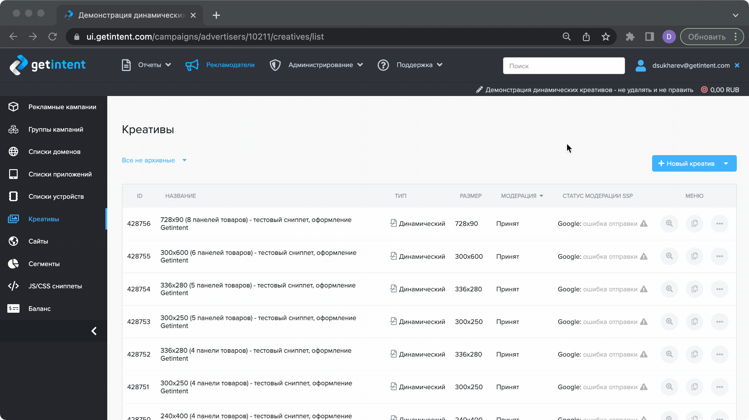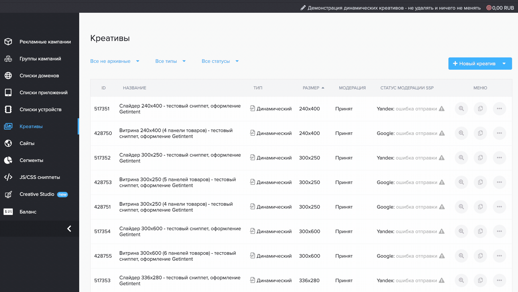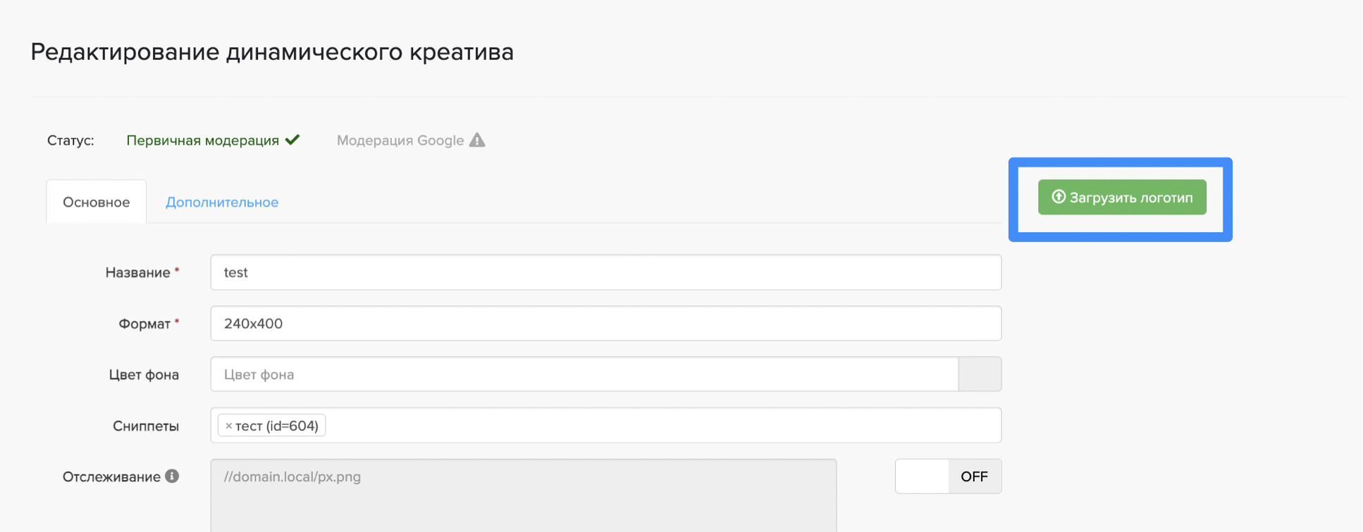 В разделе креативы выбираем "Новый креатив", "Динамический". Заполняем обязательные поля и прикрепляем созданный сниппет.