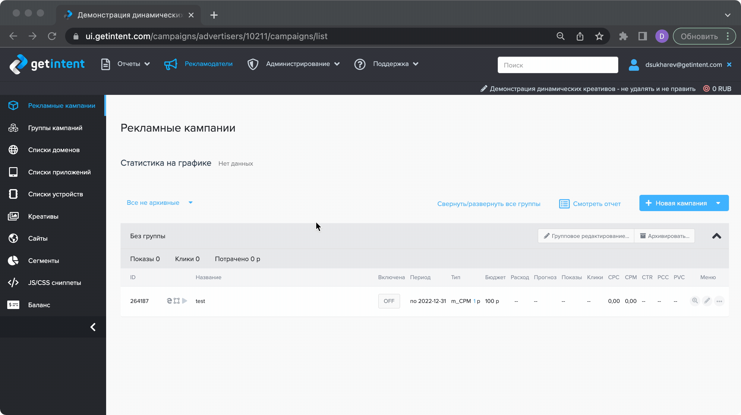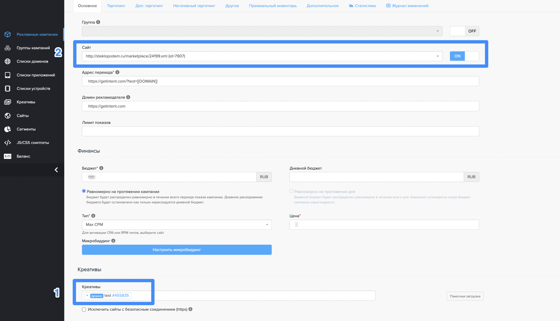 Важно, перед проверкой работы креатива добавить его в рекламную кампанию (1) и убедиться, что сайт прикреплен к рекламной кампании (2):