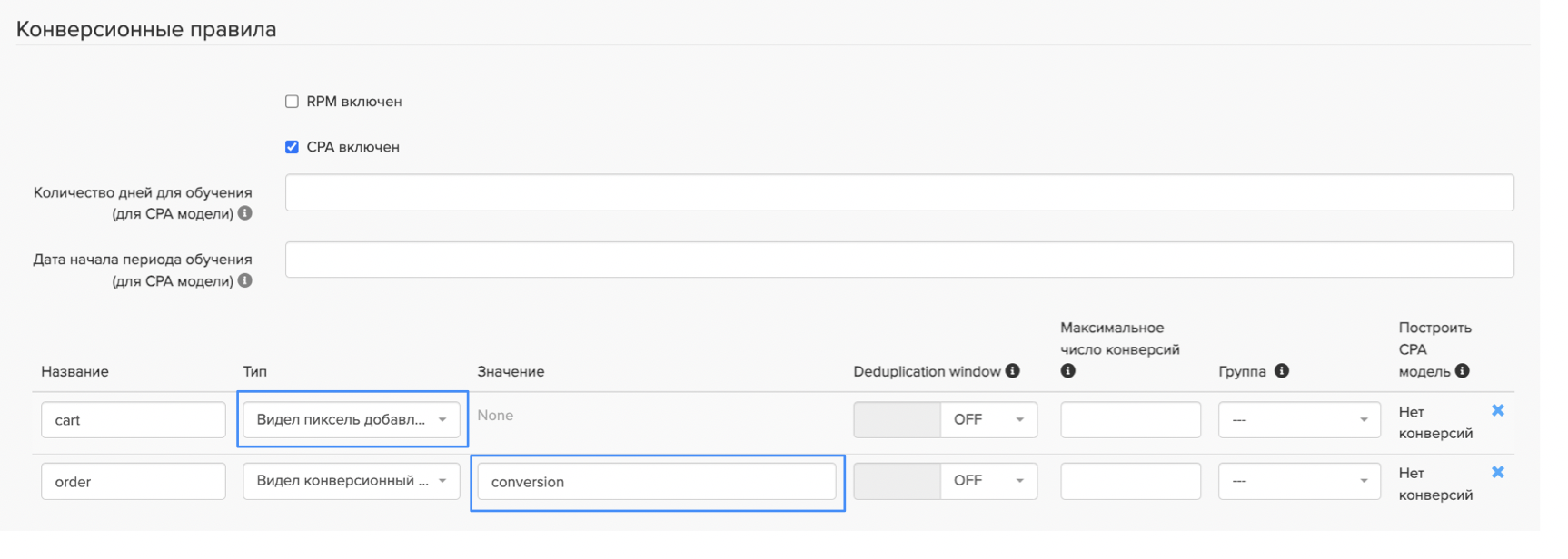 Настройка конверсионных правил