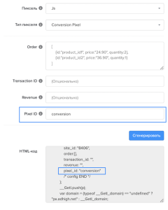 Значение - это крайне важный параметр для сбора статистики. Его содержимое обязательно для корректного отслеживания промежуточных и конверсионных целей. Необходимо, чтобы идентификатор пикселя (pixel id) на веб-сайте соответствовал заданному значению в UI. Pixel id задается при генерации пикселя и автоматически добавляется в код при нажатии на кнопку "Сгенерировать":