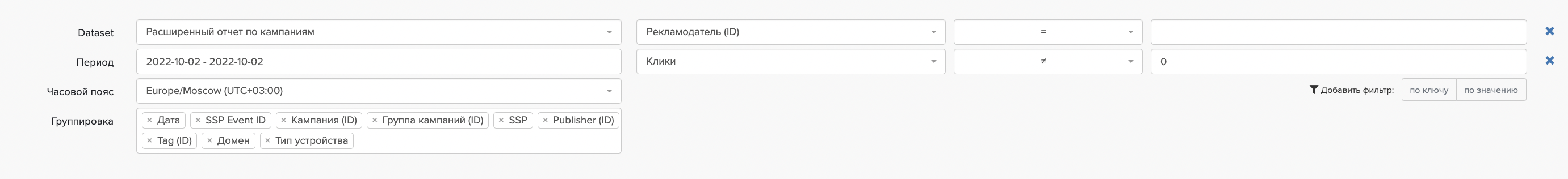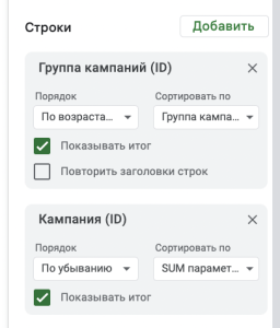 В строках добавляются атрибуты данных, нечисловые значения, которые нельзя посчитать. Эти данные представляют в отчете своего рода разрезы, в которых можно смотреть показатели, например кампания, ssp или tag id.