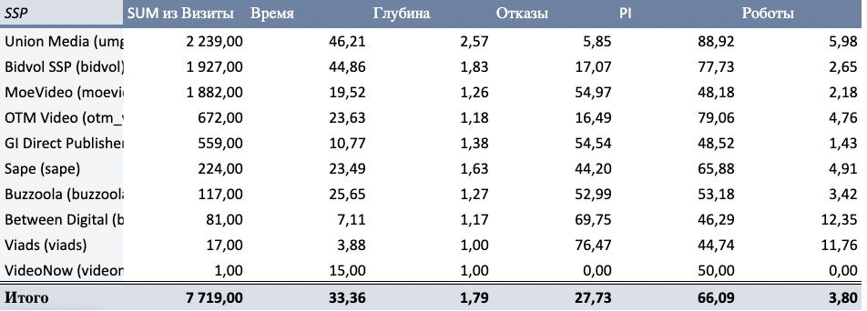 В таком случае мы можем использовать сводные таблицы, что также позволит смотреть постклик показатели в разрезе основных группировок, что доступны при использовании Analytics bridge. Например, с помощью такой таблицы вы сможете выяснить, на какой из стратегий лучше постклик и для более детального изучения трафика сделать разбивку по SSP, TAG ID или доменам.