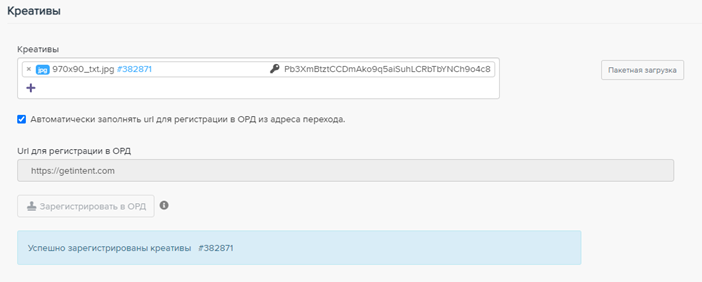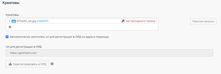 - В разделе "Креативы" на уровне кампании необходимо убедиться в том, что стоит галочка "Автоматически заполнять url для регистрации в ОРД".