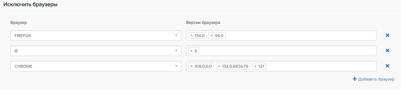 Браузеры и версии браузеров. В платформе есть возможность исключать конкретные версии браузеров. При этом, логика работы такая: если вы исключаете браузер Chrome версии 113, то при указании версии браузера "113" будут исключаться все подверсии, например, 113.1.26, 113.2.12.32 и т.д.