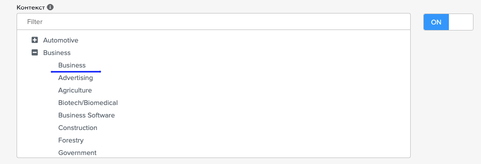 "Контекст" - возможность таргетироваться на сайты определенной тематики. Здесь доступен выбор всей категории сразу (верхняя строчка в выпадающем списке) при нажатии на название категории. Использование данной настройки позволит расширить аудиторию для таргетинга по контексту.