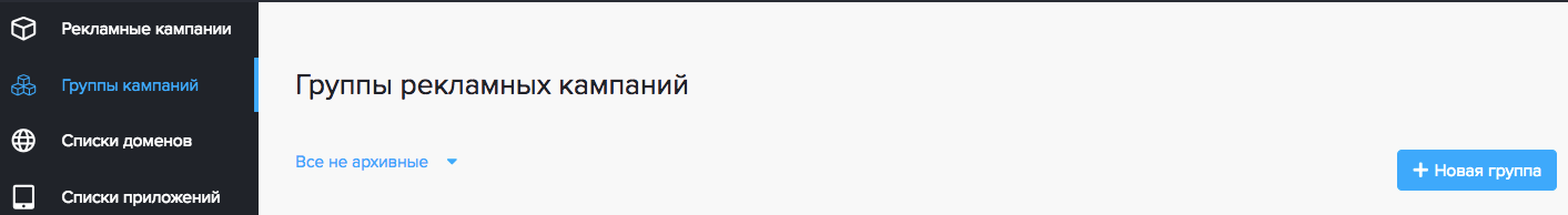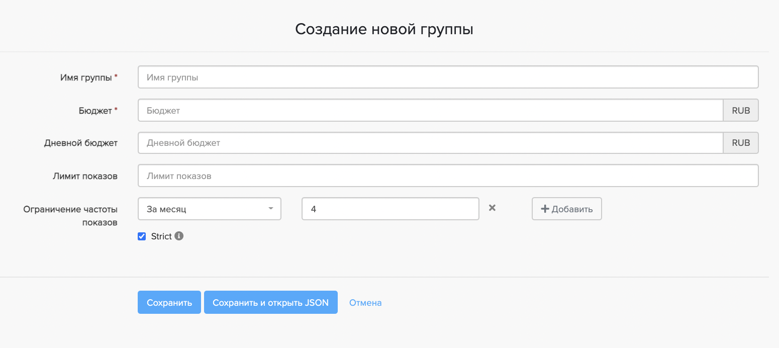 Как правило, группы кампаний необходимы для объединения нескольких стратегий размещения (т.е. нескольких РК, например, предикт и таргетинг на сторонние сегменты). При использовании группы кампаний задается общий бюджет или лимит показов, при достижении которых будут остановлены все кампании, входящие в данную группу. При этом не обязательно заполнять все поля, достаточно задать название группы и бюджет. Также, для группы кампаний можно задать частоту, которая будет рассчитываться для всех кампаний, входящих в данную группу и дневной бюджет.