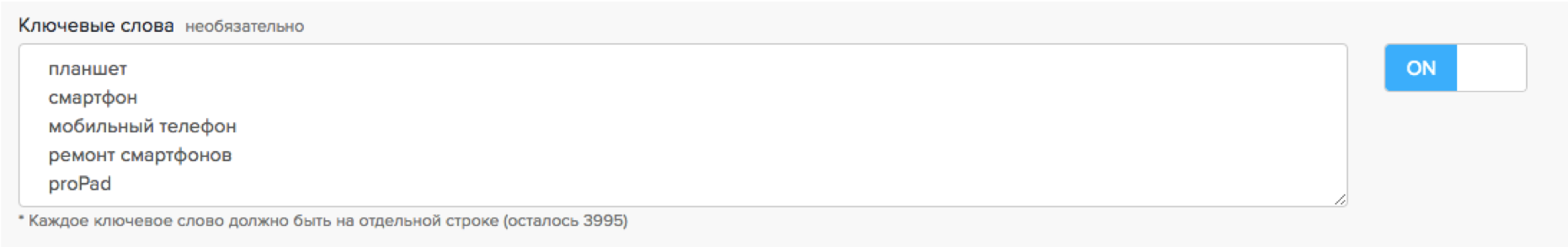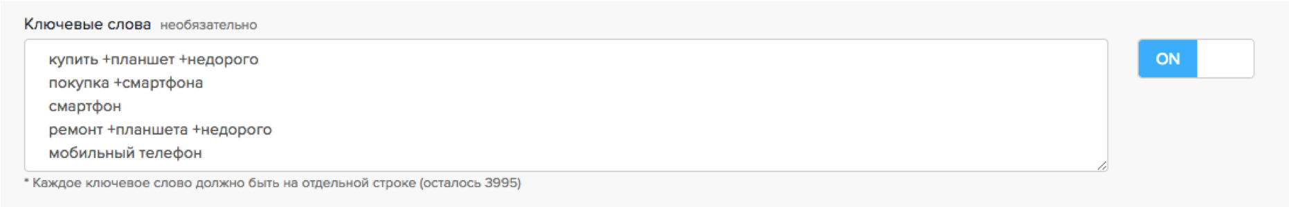 Для таргетинга по ключевым словам используйте только слова или сочетания слов без символов. При этом каждое ключевое слово или фраза должны быть на отдельной строке.