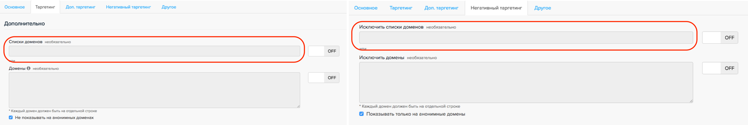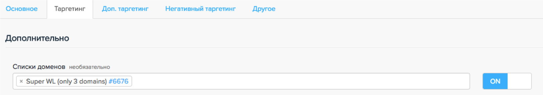Если, например, для показов на анонимных доменах установлены взаимоисключающие настройки, платформа уведомит о невозможности сохранить кампанию. Однако платформа не распознает противоречащие гео-настройки и списки доменов, поэтому кампания может не стартовать.