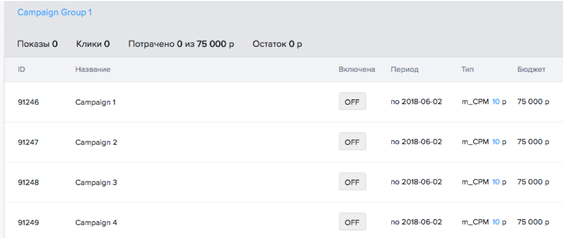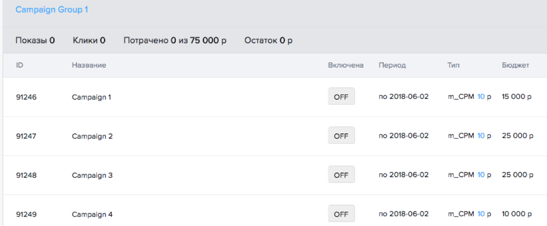 Настройки группы кампаний ограничивают входящие в нее кампании, поэтому открутка всех кампаний прекращается по достижении общего бюджета.