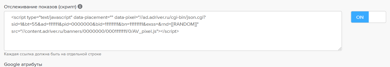 В каждом из полей, которое будет выбрано для добавления пикселя отслеживания показов есть подсказка по формату самого пикселя.