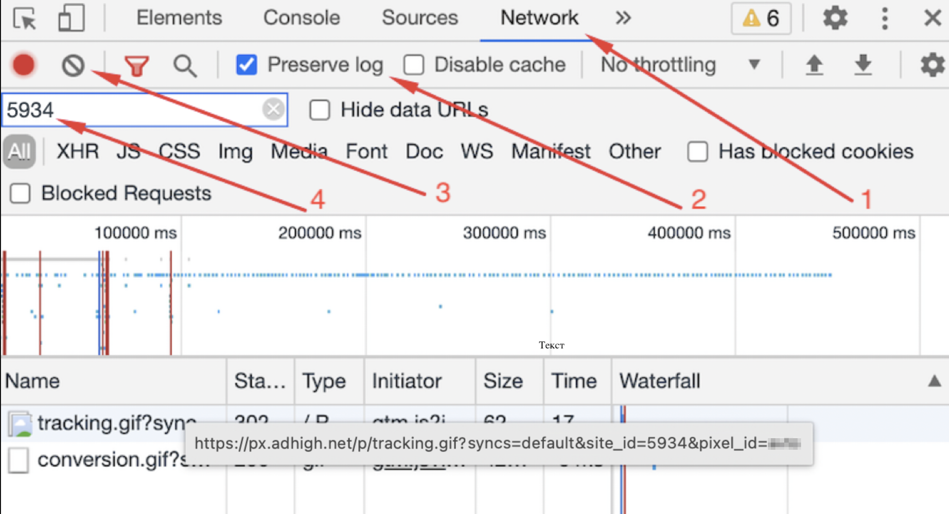 Для проверки пикселя необходимо использовать консоль браузера. Удобнее всего производить проверку в браузере Chrome. После перехода на сайт откройте консоль (f12 на windows, fn+f12 на mac). Далее перейдите на вкладку Network, поставьте галочку около надписи Preserve log, нажмите кнопку "Очистить" и вбейте в фильтр id проверяемого пикселя или id сайта.