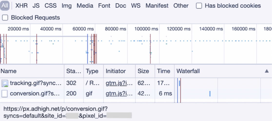 После этого для проверки трекингового пикселя обновите страницу. Для проверки конверсионных пикселей совершите на сайте действия, на которые настроены пиксели. И вы увидите запрос в нашу систему, который сообщает о совершении того или иного действия. Трекинг-пиксель будет содержать в ссылке слово trackingПри совершении конверсии появится запрос c conversion в запросе и заданным pixel id. Пиксель корзины содержит слово cart в запросе.