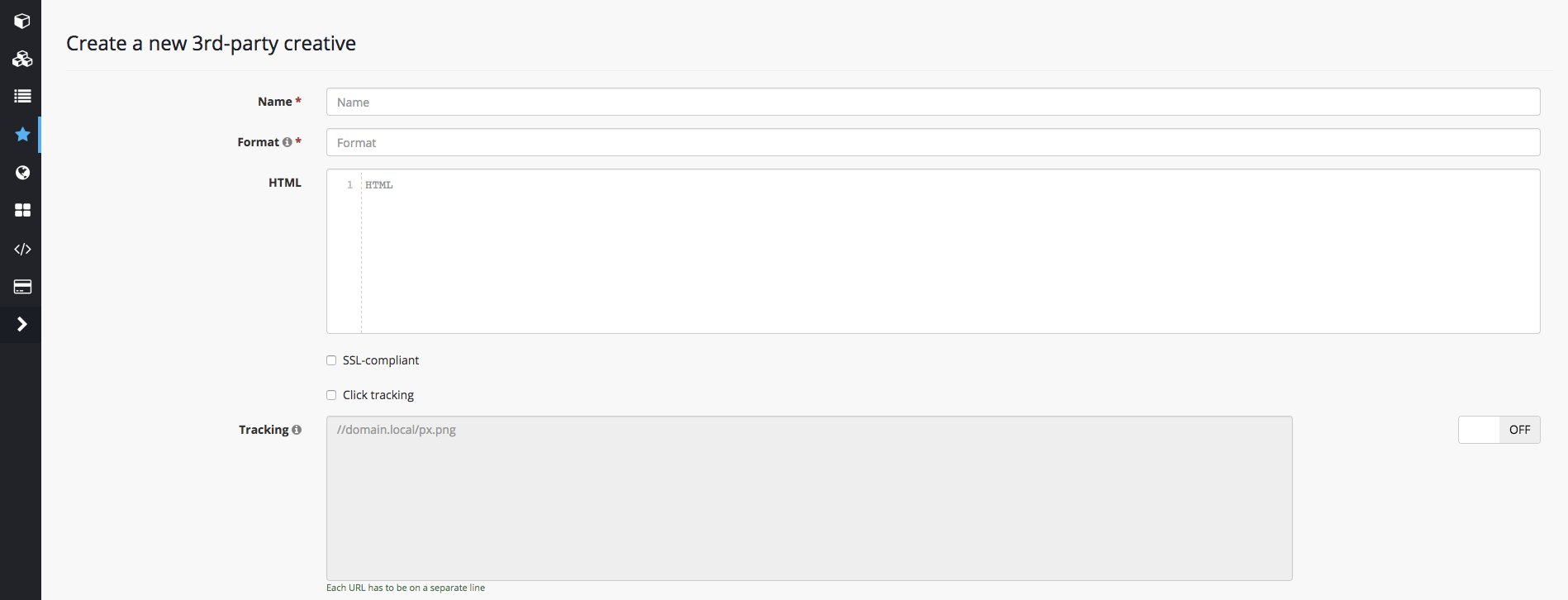 ‪To upload a 3rd-party creative, choose the ‘3-rd party’ option in a menu in the "Creatives" tab.‬‬